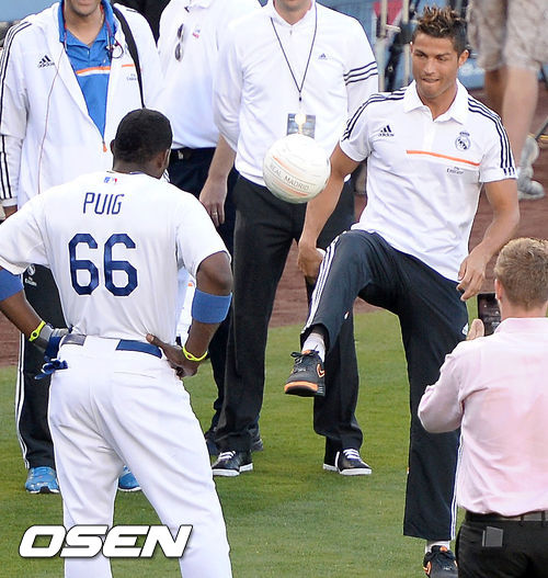 1일(이하 한국시간) 미국 캘리포니아주 로스앤젤레스 다저스타디움에서 열린 2013 메이저리그 LA 다저스와 뉴욕 양키스의 경기에 앞서 시구 나서는 호날두가 다저스 푸이그와 축구공을 차고 있다.