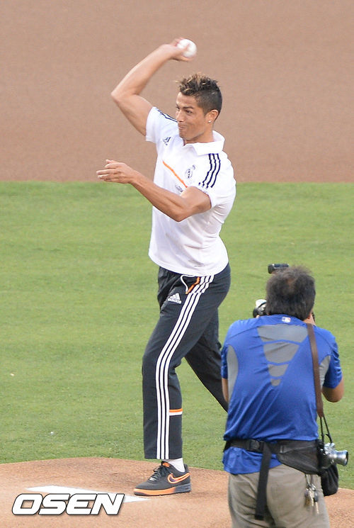 1일(이하 한국시간) 미국 캘리포니아주 로스앤젤레스 다저스타디움에서 열린 2013 메이저리그 LA 다저스와 뉴욕 양키스의 경기에 앞서 레알 마드리드 호날두가 시구를 하고 있다.