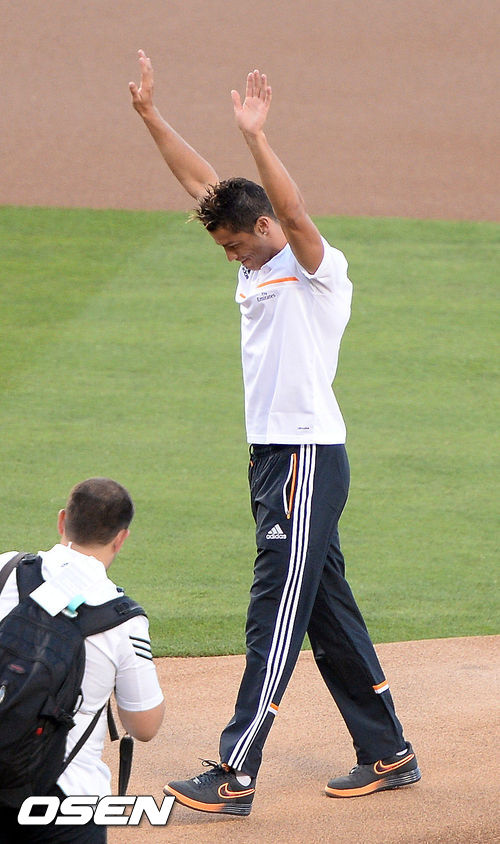 1일(이하 한국시간) 미국 캘리포니아주 로스앤젤레스 다저스타디움에서 열린 2013 메이저리그 LA 다저스와 뉴욕 양키스의 경기에 앞서 레알 마드리드 호날두가 시구를 마친후 팬들에게 인사를 하고 있다