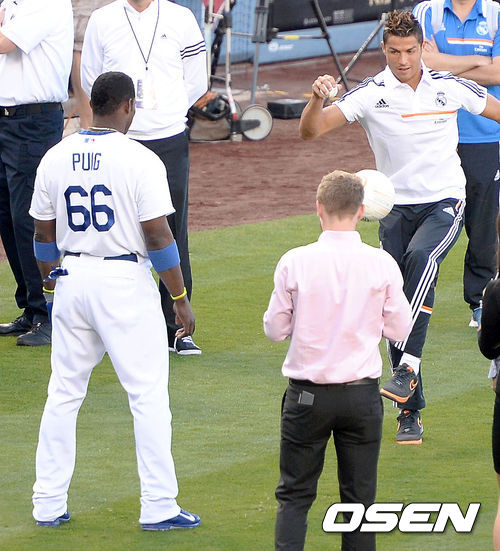 1일(이하 한국시간) 미국 캘리포니아주 로스앤젤레스 다저스타디움에서 열린 2013 메이저리그 LA 다저스와 뉴욕 양키스의 경기, 경기에 앞서 레알마드리드 크리스티아누 호날두가 시구에 앞서 LA 다저스 푸이그와 패스 게임을 하고 있다.