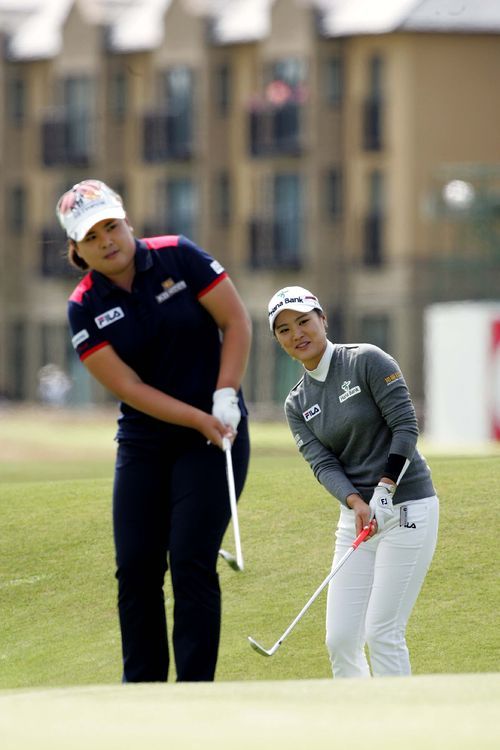 [OSEN=스포츠부] 박인비(25, KB금융그룹)와 유소연(23, 하나금융그룹)이 브리티시 오픈 공식 연습라운드 중 3번홀에 나란히 서서 어프로치 연습을 하고 있다.