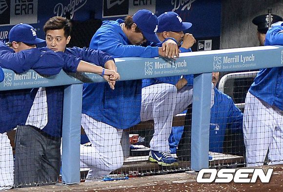 9회초 2사 1,2루에서 양키스 오버베이의 중전 적시타 때 LA 류현진이 덕아웃에서 아쉬워하고 있다. /sunday@osen.co.kr