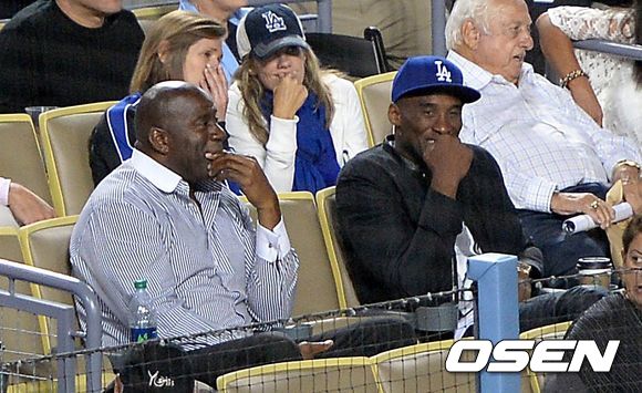 1일(이하 한국시간) 미국 캘리포니아주 로스앤젤레스 다저스타디움에서 열린 2013 메이저리그 LA 다저스와 뉴욕 양키스의 경기, LA 레이커스 코비 브라이언트가 매직 존슨과 관중석에서 이야기를 나누고 있다.