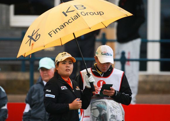 박인비가 첫 홀인 1번홀 출발에 앞서 캐디와 공략 방법을 의논하고 있다.