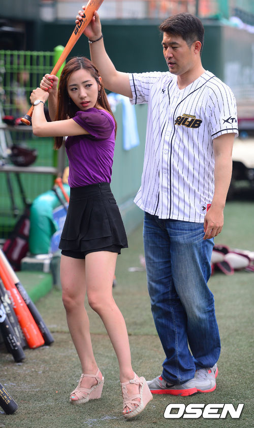 1일 오후 서울 목동구장에서 열린 2013 한국야쿠르트 세븐프로야구 넥센 히어로즈와 한화 이글스의 경기에 앞서 XTM 정순주 아나운서가 이숭용 해설위원에게 타격 자세를 배우고 있다.