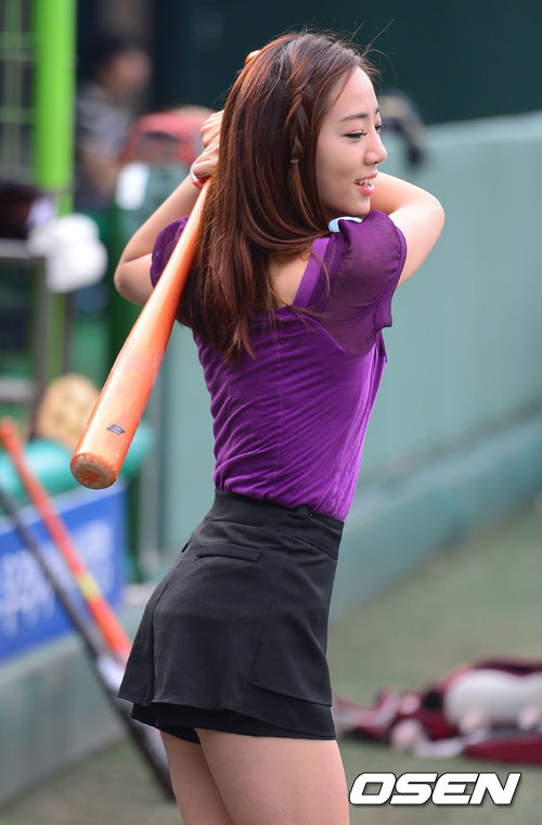 1일 오후 서울 목동구장에서 열린 2013 한국야쿠르트 세븐프로야구 넥센 히어로즈와 한화 이글스의 경기에 앞서 XTM 정순주 아나운서가 방망이를 들고 타격자세를 취하고 있다