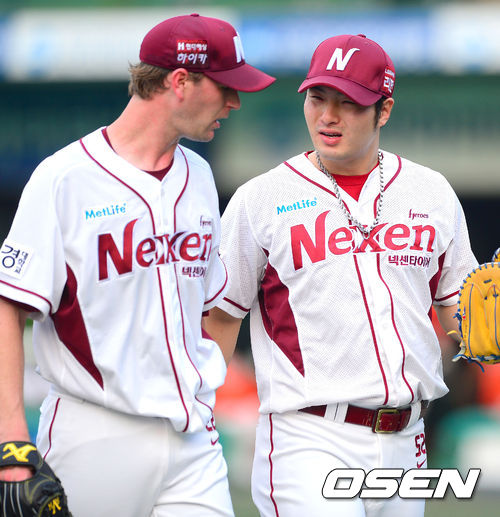 1일 오후 서울 목동구장에서 열린 2013 한국야쿠르트 세븐프로야구 넥센 히어로즈와 한화 이글스의 경기 1회초 한화 공격을 막은 넥센 선발투수 밴헤켄이 박병호와 이야기를 나누며 더그아웃으로 들어가고 있다.