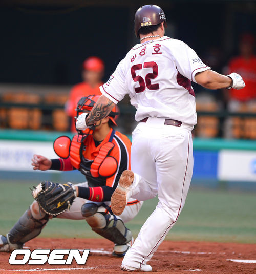 1일 오후 서울 목동구장에서 열린 2013 한국야쿠르트 세븐프로야구 넥센 히어로즈와 한화 이글스의 경기 2회말 넥센 강정호의 선취 1타점 적시타때 2루 주자 박병호가 선취득점을 올리고 있다.