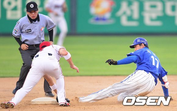 3회초 삼성 공격 2사 주자 없는 상황 6번타자 채태인이 좌중간 안타를 날리고 2루까지 내달리다 KIA 2루수 안치홍의 태그에 걸려 아웃되고 있다.