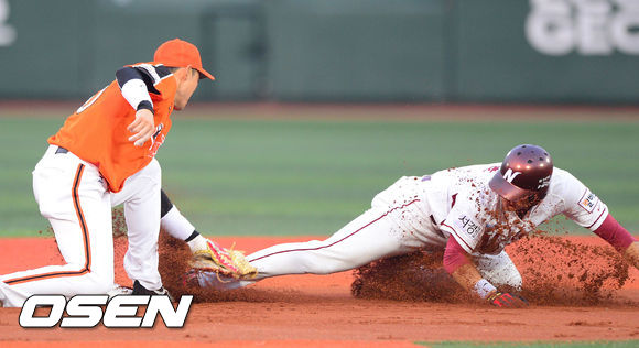 1일 오후 서울 목동구장에서 열린 2013 한국야쿠르트 세븐프로야구 넥센 히어로즈와 한화 이글스의 경기 2회말 넥센 안태영의 타석 한화 조지훈 투수의 폭투때 1루 주자 강정호가 2루까지 진루시도했지만 태그아웃되고 있다.