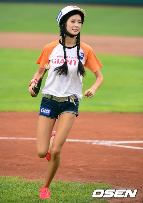 배트걸로 변신한 롯데 치어리더 박기량이 그라운드에서 배트를 줍고 뛰어 들어오고 있다.