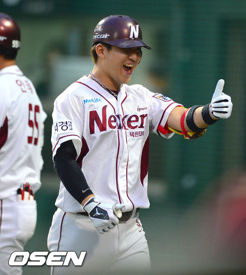 1일 오후 서울 목동구장에서 열린 2013 한국야쿠르트 세븐프로야구 넥센 히어로즈와 한화 이글스의 경기 4회말 무사 만루 넥센 김민성이 만루홈런을 날리고 엄지손가락을 보이고 있다