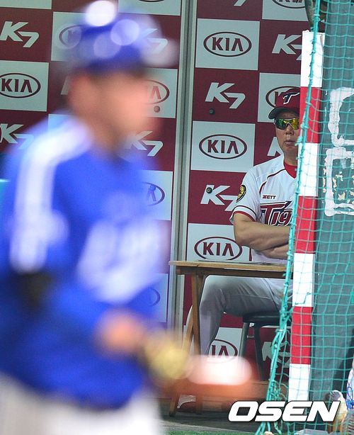 5회초 삼성 공격 상황, KIA가 0-6으로 뒤지고 있는 가운데 KIA 선동렬 감독이 그라운드를 바라보고 있다.