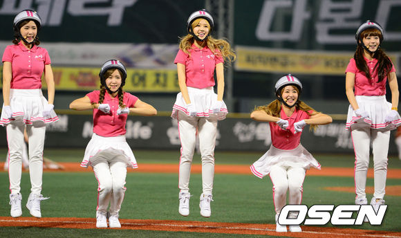 1일 오후 서울 목동구장에서 열린 2013 한국야쿠르트 세븐프로야구 넥센 히어로즈와 한화 이글스의 경기 5회말 종료 클리닝타임때 걸그룹 크레용팝이 축하공연을 펼치고 있다.