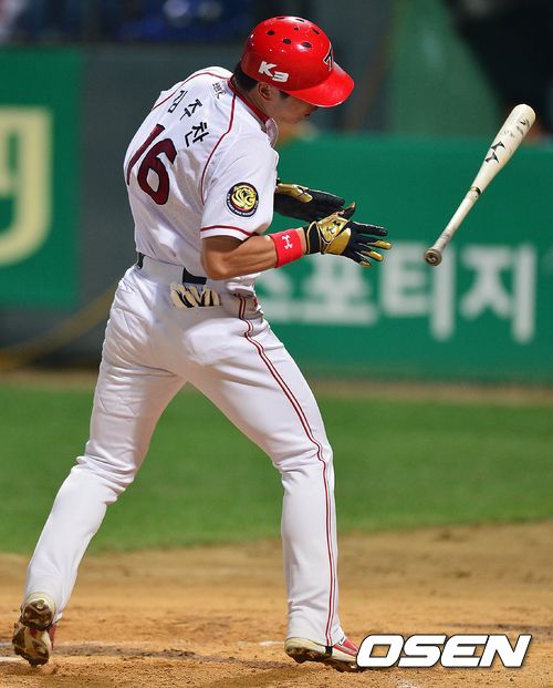 6회말 KIA 공격 2사 주자없는 상황 2번타자 김주찬이 삼성 선발 밴덴헐크의 투구에 손을 맞고 배트를 놓치고 있다.