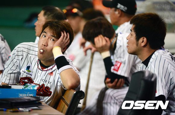 5회초 2사에서 우천으로 경기가 중단되자 롯데 전준우가 더그아웃에서 껌을 씹으며 경기 상황을 기다리고 있다.