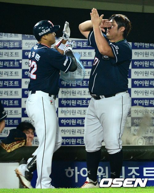 7회초 2사에서 두산 홍성흔이 솔로포를 날리고 더그아웃에서 최준석과 세레모니를 하고 있다.