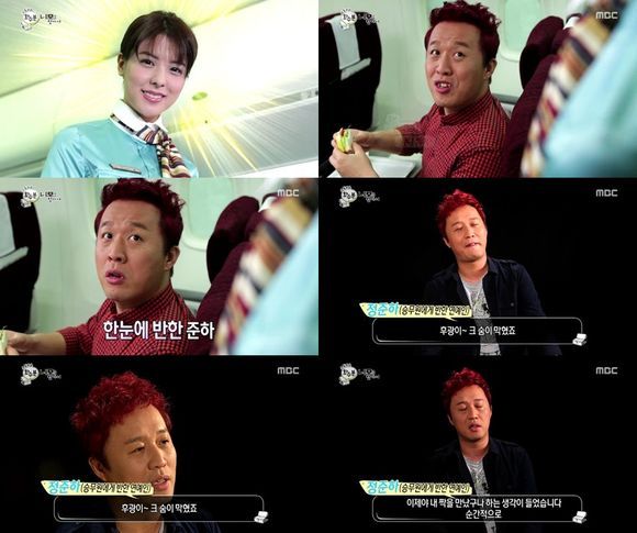 비행기에서 처음으로 승무원인 아내를 처음 만난 정준하는 당시의 소감을 전하며 "후광이 났다. 숨이 막히더라"고 말했다.