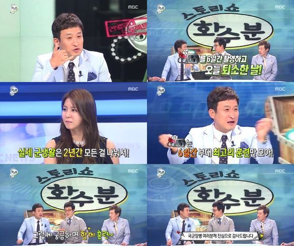 그는 이날 "실제 군생활과 '진짜사나이'를 비교한다면 어떤가"라는 MC 김성주의 질문에 "이것을 꼭 말씀드리고 싶었다. 오늘도 '진짜사나이' 퇴소 이후 바로 (녹화장에) 온 것이다"라고 운을 뗐다.