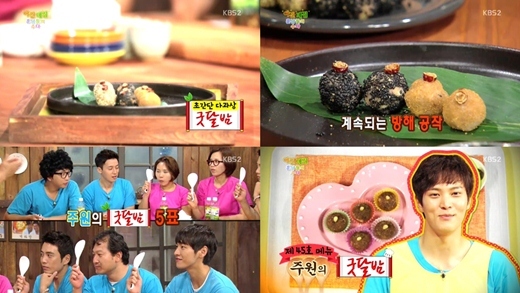 주원은 1일 밤 방송된 KBS 2TV 예능프로그램 '해피투게더3' 야간매점 코너에 직접 만든 영양 간식 굿달밤을 들고 나와 메뉴 등록에 성공했다. 굿달밤은 밤과 잣, 호두 등을 으깨서 동그랗게 뭉친 후 계피가루나 깻가루를 묻힌 간식.