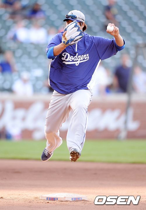2일(이하 한국시간) 미국 일리노이주 시카고 리글리 필드에서 열린 2013 메이저리그 LA 다저스와 시카고 컵스의 경기, 경기에 앞서 LA 류현진이 수비 훈련을 하고 있다.