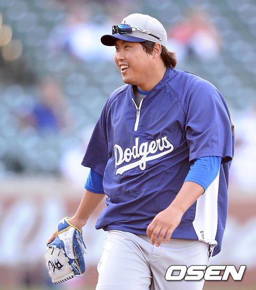 2일(이하 한국시간) 미국 일리노이주 시카고 리글리 필드에서 열린 2013 메이저리그 LA 다저스와 시카고 컵스의 경기, 경기에 앞서 LA 류현진이 수비 훈련을 하며 미소를 짓고 있다.
