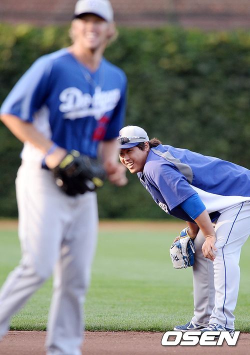 2일(이하 한국시간) 미국 일리노이주 시카고 리글리 필드에서 열린 2013 메이저리그 LA 다저스와 시카고 컵스의 경기, 경기에 앞서 LA 류현진이 커쇼와 수비 훈련을 하며 미소짓고 있다.