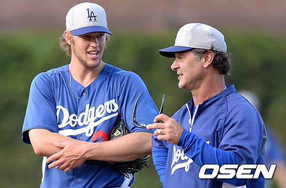 2일(이하 한국시간) 미국 일리노이주 시카고 리글리 필드에서 열린 2013 메이저리그 LA 다저스와 시카고 컵스의 경기, 경기에 앞서 LA 커쇼가 매팅리 감독과 이야기를 하고 있다.