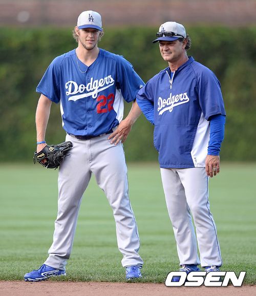 2일(이하 한국시간) 미국 일리노이주 시카고 리글리 필드에서 열린 2013 메이저리그 LA 다저스와 시카고 컵스의 경기, 경기에 앞서 LA 커쇼가 매팅리 감독과 이야기를 하고 있다.