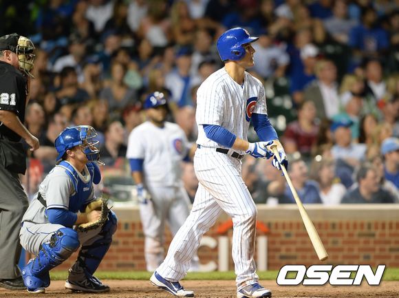 8회말 1사에서 시카고 리조가 좌월 솔로 홈런을 치고 타구를 바라보고 있다.