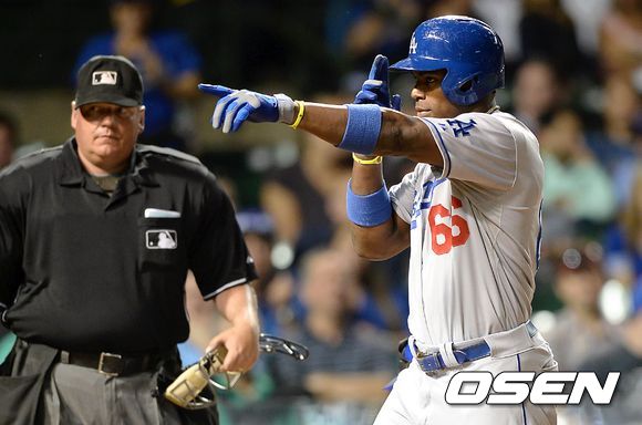9회초 1사에서 LA 푸이그가 좌월 솔로 홈런을 치고 홈에서 환호하고 있다.