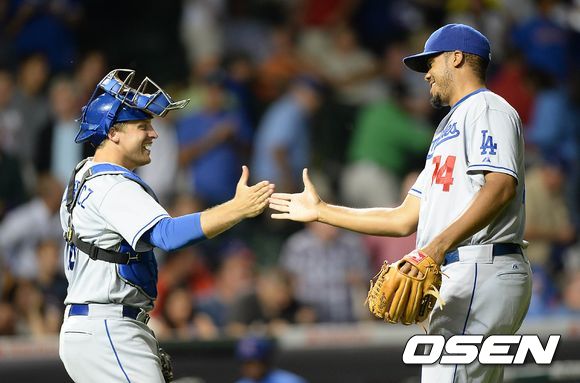 경기 종료 후 LA 포수 페데로위츠와 젠슨이 승리에 환호하고 있다. /sunday@osen.co.kr