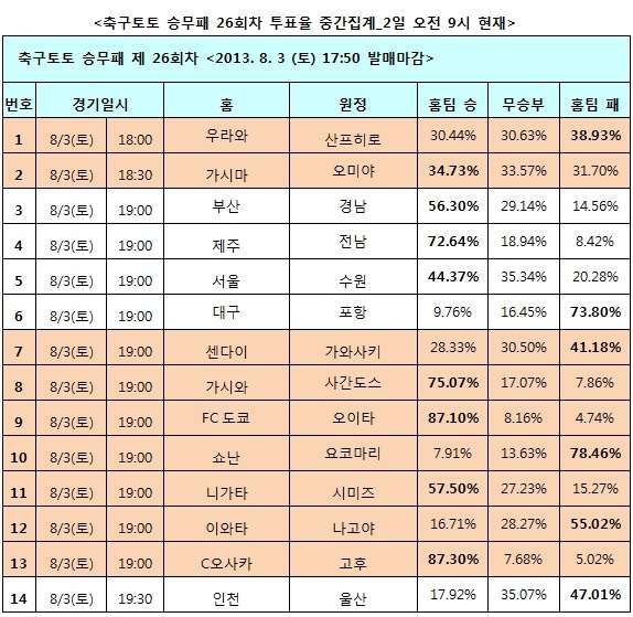 [축구토토] 국민체육진흥공단(www.kspo.or.kr)이 발행하는 체육진흥투표권 수탁사업자인 스포츠토토 온라인 공식 발매사이트 베트맨(www.betman.co.kr)은 오는 3일에 열리는 국내 프로축구 K리그 클래식 5경기와 일본 프로축구(J리그) 9경기 등 총 14경기를 대상으로 한 축구토토 승무패 26회차 투표율 중간집계 결과, '슈퍼매치' 서울-수원(5경기)전에서 국내 축구팬 44.37%는 서울이 승리를 거둘 것으로 예상했다고 밝혔다.