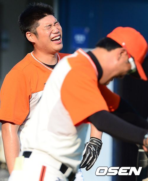 2일 오후 창원 마산구장에서 열리는 NC 다이노스와 한화 이글스의 경기, 경기에 앞서 한화 최진행이 장종훈 코치와 이야기를 나누며 즐거워하고 있다.