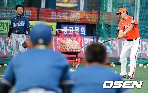 2일 오후 창원 마산구장에서 열리는 NC 다이노스와 한화 이글스의 경기, 경기에 앞서 한화 이종범 코치가 NC 볼보이를 맡고 있는 김해 내동중학교 야구부 학생들에게 펑고를 치며 수비훈련을 지도하고 있다.