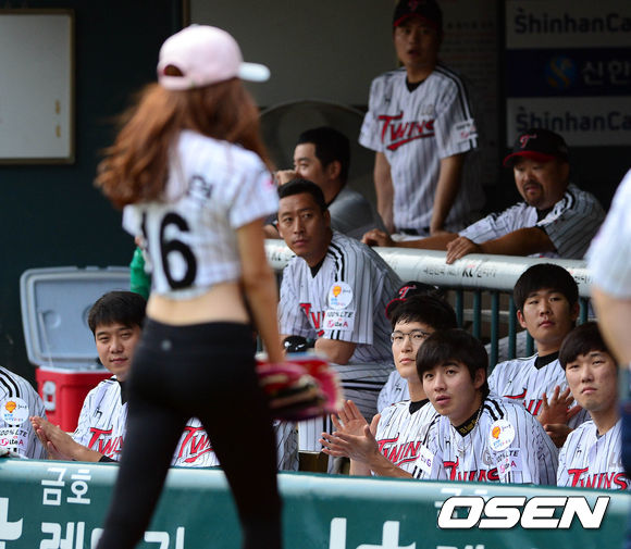 2일 오후 서울 잠실구장에서 열린 '2013 한국야쿠르트 세븐 프로야구' LG 트윈스와 삼성 라이온즈의 경기 시작전 시구를 마친 원자현이 LG덕아웃 앞을 지나가고 있다.