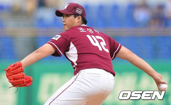 1회말 KIA 공격, 넥센 선발 김영민이 힘차게 공을 뿌리고 있다. 조상우의 유니폼을 입고 투구하고 있는 김영민.