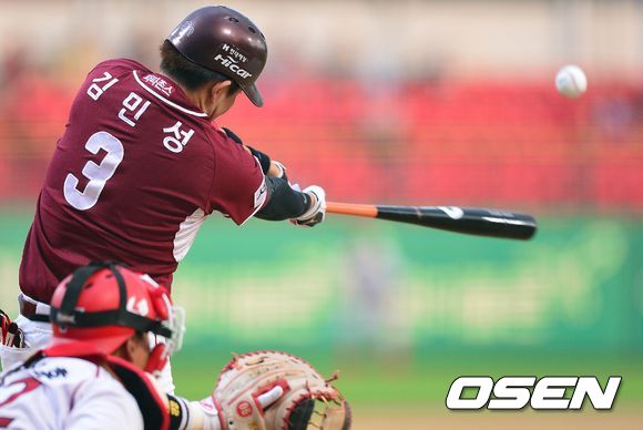 2회초 넥센 공격, 선두타자 나선 김민성이 좌측 2루타를 날리고 있다.