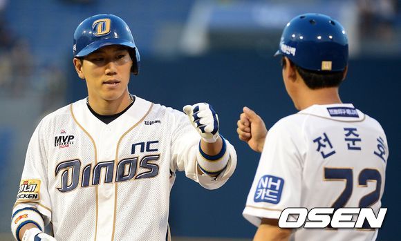 3회말 1사 3루에서 NC 모창민이 1타점 적시타를 날리고 전준호 코치와 주먹을 맞대고 있다.