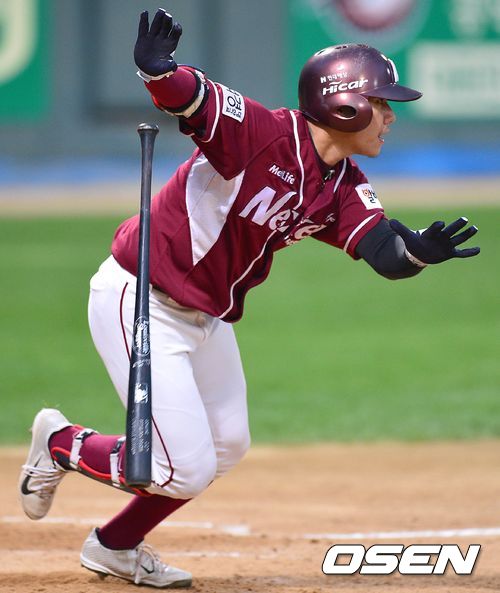 3회초 넥센 공격 1사 2루 상황, 2번타자 문우람이 역전 1타점 중전안타를 날리고 있다.