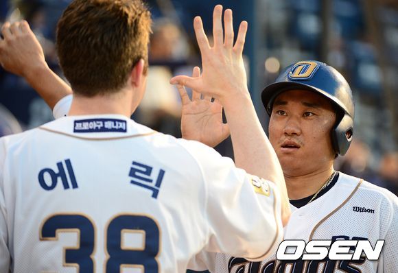 3회말 1사 3루에서 NC 모창민의 1타점 적시타에 김태군이 홈을 밟고 에릭과 하이파이브를 하고 있다.
