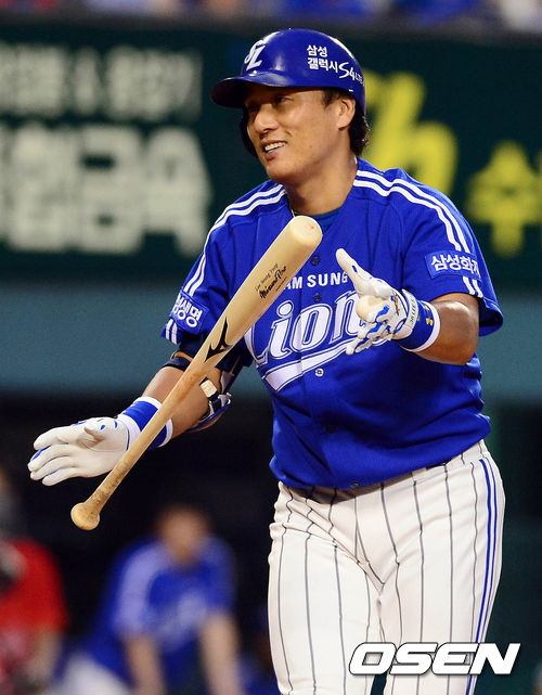 2일 오후 서울 잠실구장에서 열린 '2013 한국야쿠르트 세븐 프로야구' LG 트윈스와 삼성 라이온즈의 경기 4회초 1사 이승엽이 헛스윙 삼진 후 미소를 짓고 있다.