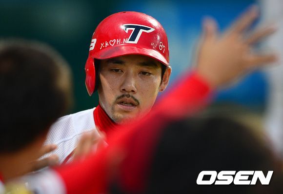 3회말 KIA 공격 무사 2루 상황, 2번타자 김주찬의 번트에 이은 상대 수비의 송구실책으로 홈을 밟은 2루주자 이용규가 더그아웃 동료들과 인사를 나누고 있다.