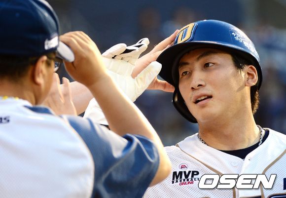 3회말 1사 1,3루에서 NC 나성범이 권희동의 1타점 적시타에 홈을 밟고 동료선수들과 하이파이브를 하고 있다.