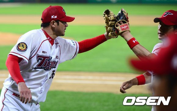 5회초 넥센 공격 2사 1, 3루 상황, 4번타자 박병호를 중견수 플라이로 이끌며 무실점으로 이닝을 마무리지은 KIA 선발 서재응이 김주찬과 인사를 나누고 있다.