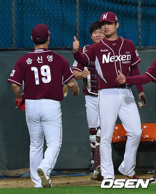 7회말 KIA 공격 2사 2, 3루 상황, 김주형을 좌익수 플라이로 이끌며 무실점으로 이닝을 마친 넥센 투수 송신영이 손승락과 인사를 나누고 있다.