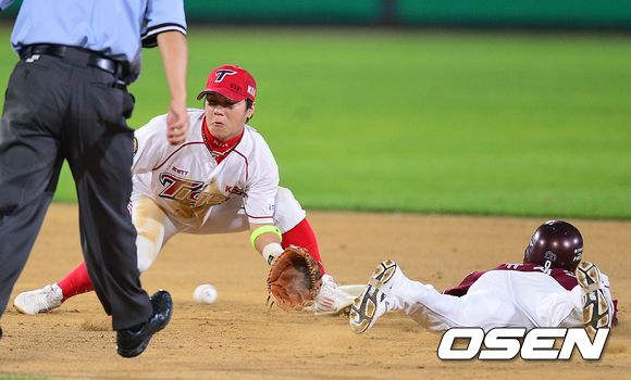8회초 넥센 공격 1사 1루 상황, 대주자 유재신이 2루 도루에 성공하고 있다.