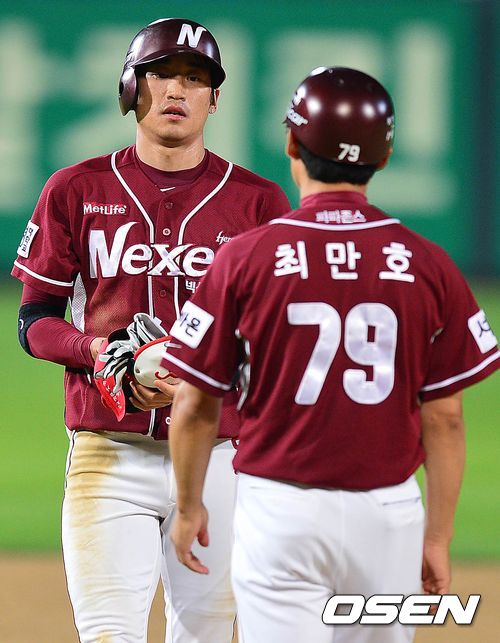 8회초 넥센 공격 2사 3루 상황, 1번타자 장기영이 역전 1타점 좌익선상 2루타를 날리고 최만호 코치와 인사를 나누고 있다.