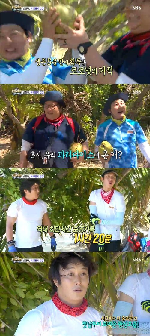 병만족이 섬 도착 5분만에 코코넛을 획득하고 1시간 20분 만에 숙소를 마련했다.