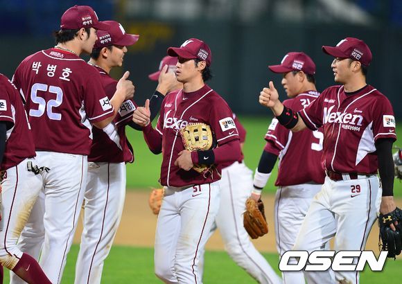 경기 종료 직후 넥센 선수들이 마운드에서 하이파이브를 나누고 있다.